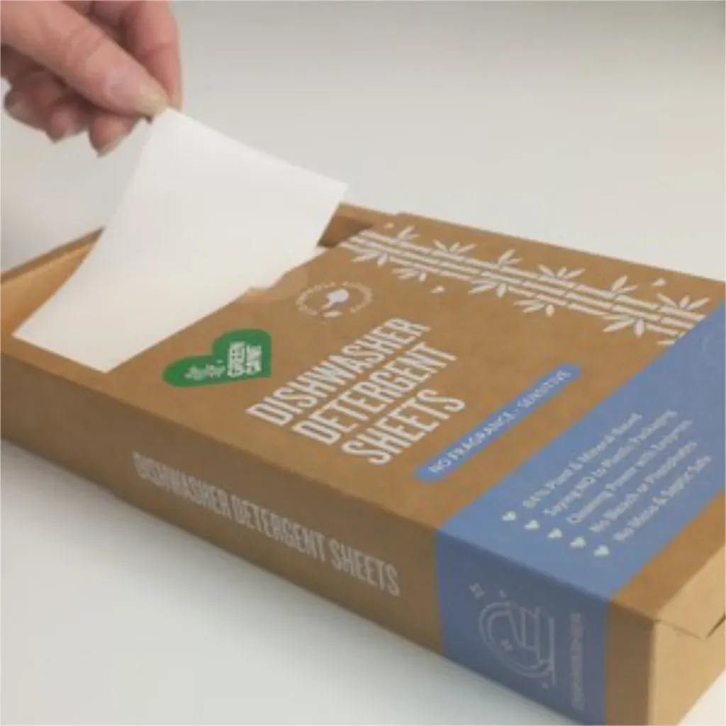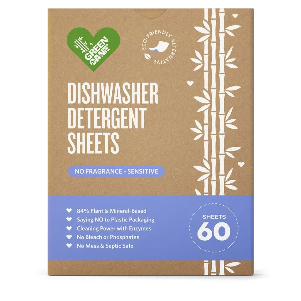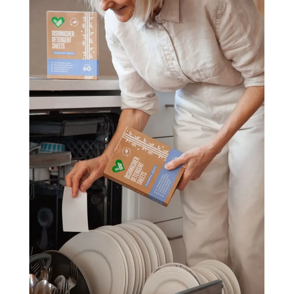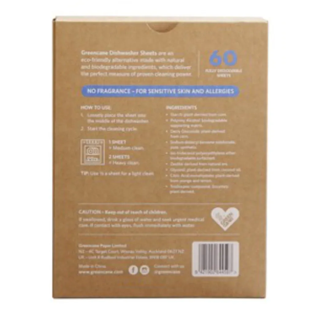 Pre-measured fragrance-free dishwasher sheets — 84% plant and mineral-based, biodegradable, and enzyme-powered. Plastic-free packaging. One sheet per cycle. Responsibly made in China. Pack of 60.