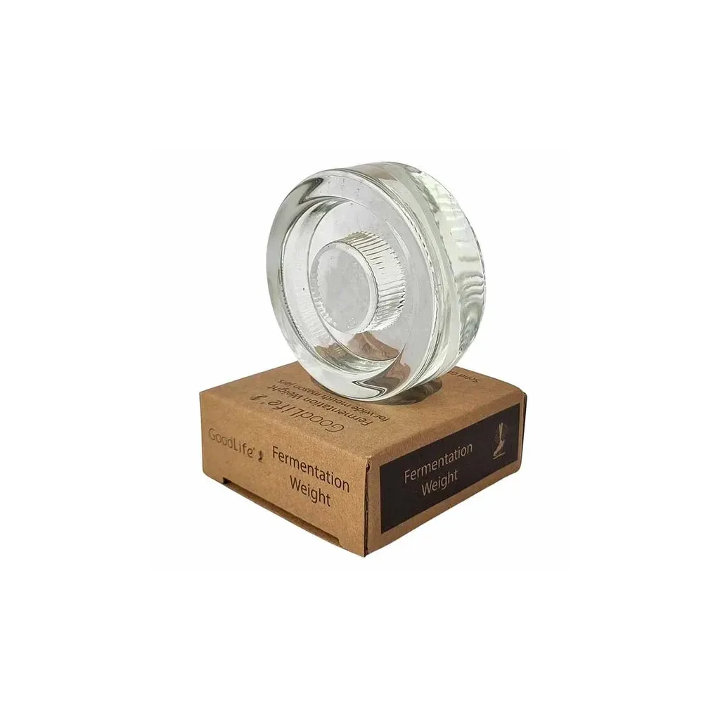A glass weight to keep fermenting vegetables submerged below the brine — exposure to air causes spoilage, so keeping everything submerged is important for safe lacto-fermentation. 69mm diameter, suited to 86mm wide-mouth jars. Made in China.