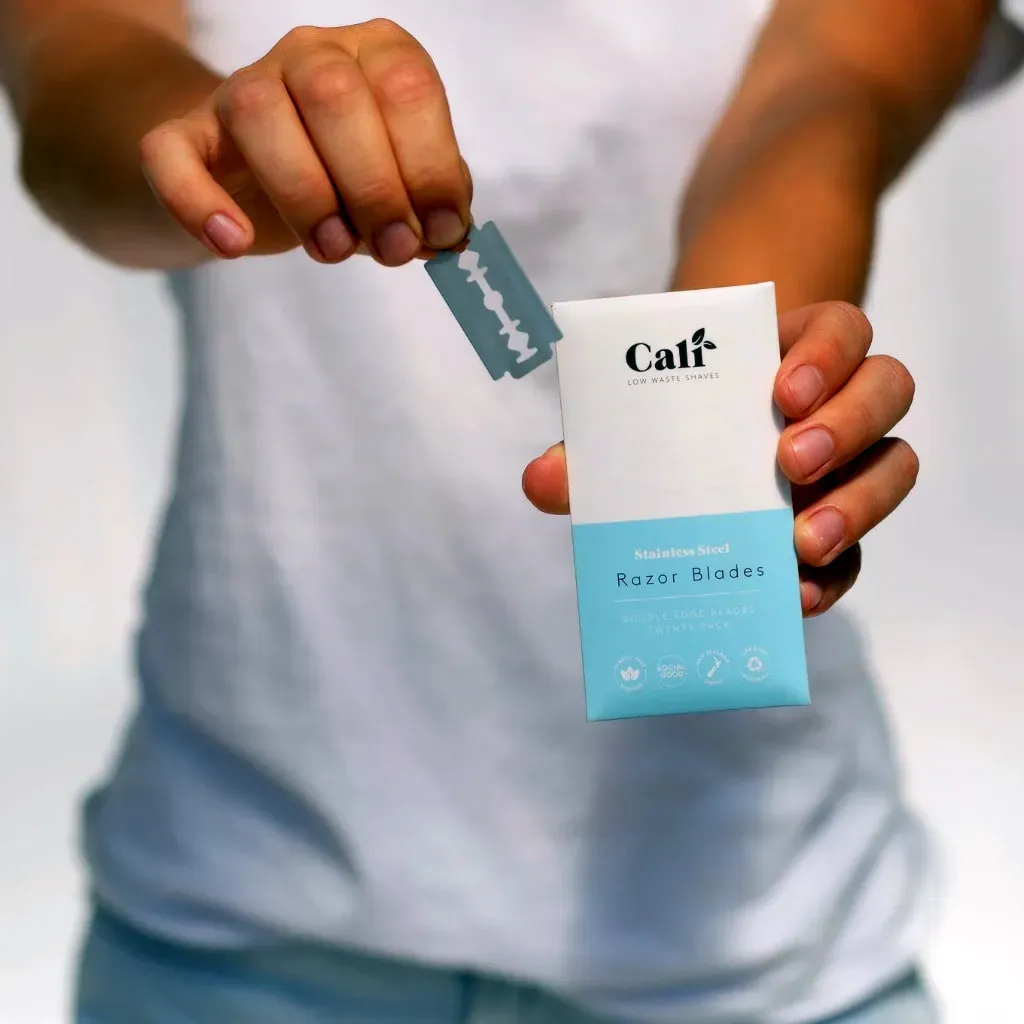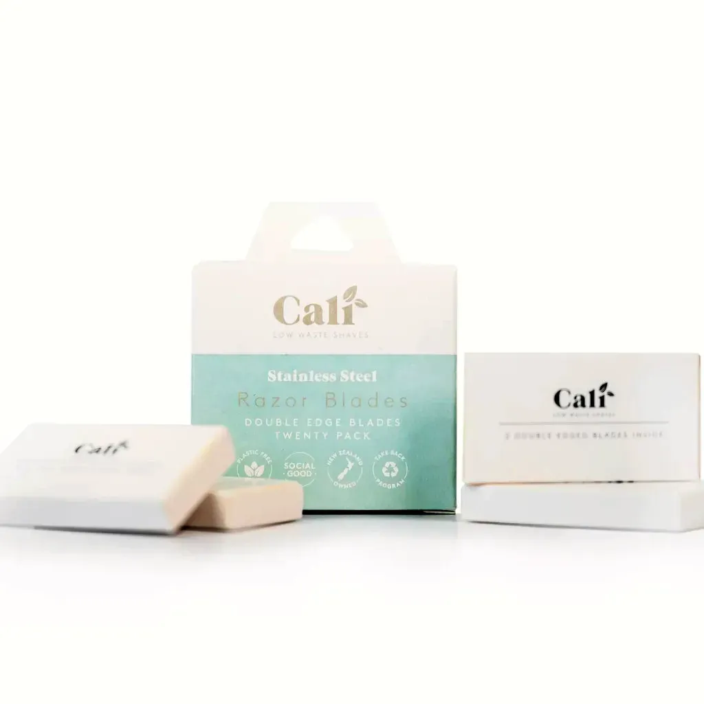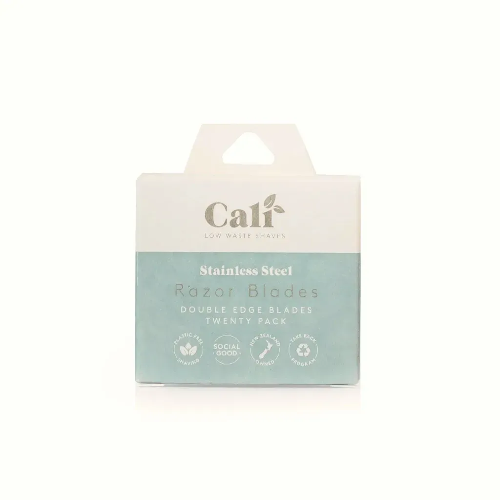 Standard-shape stainless steel razor blades compatible with most safety razors. Box of 20, each blade individually wrapped in paper for safe handling. Responsibly made in China, packaged in recyclable cardboard.